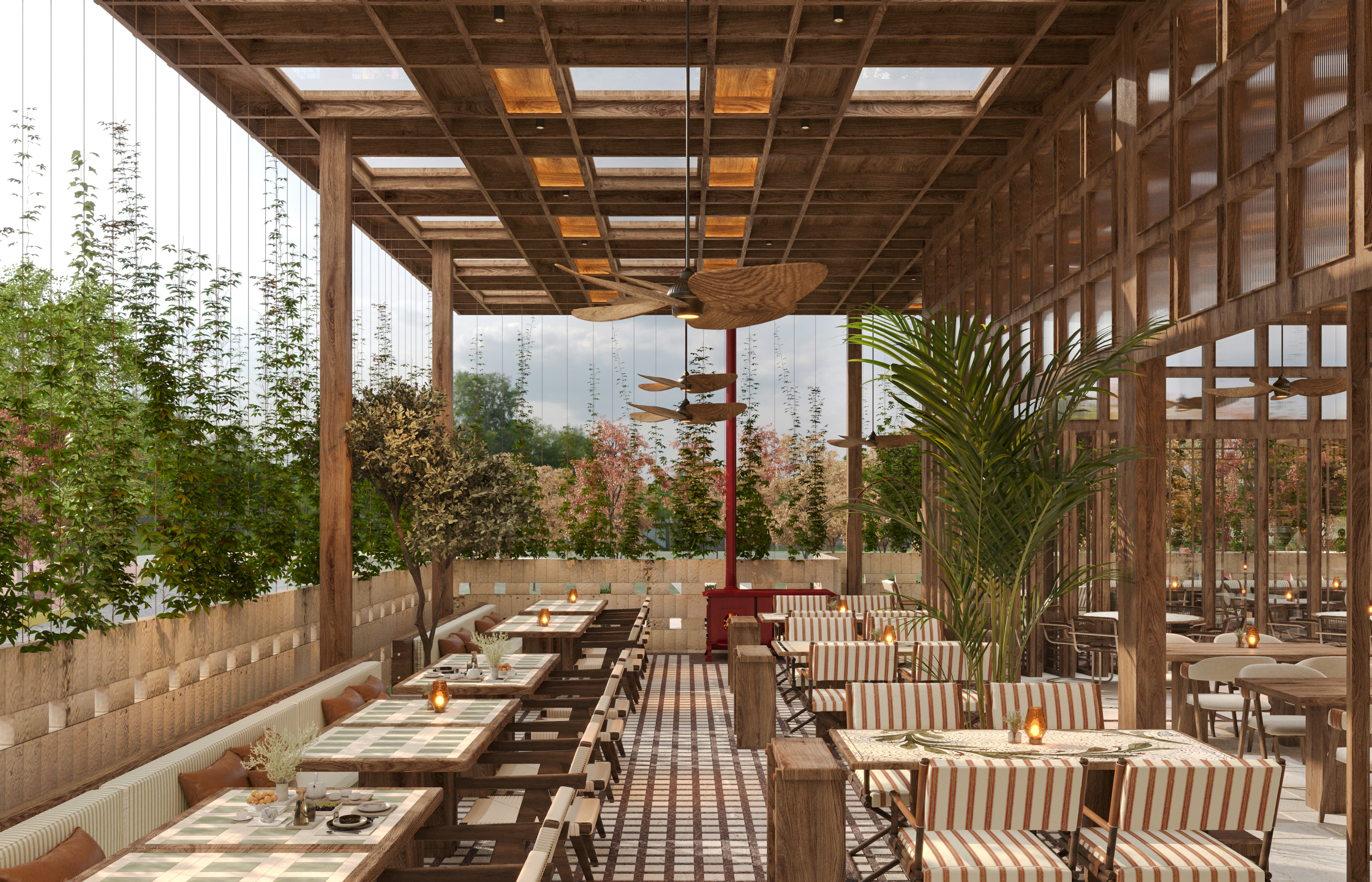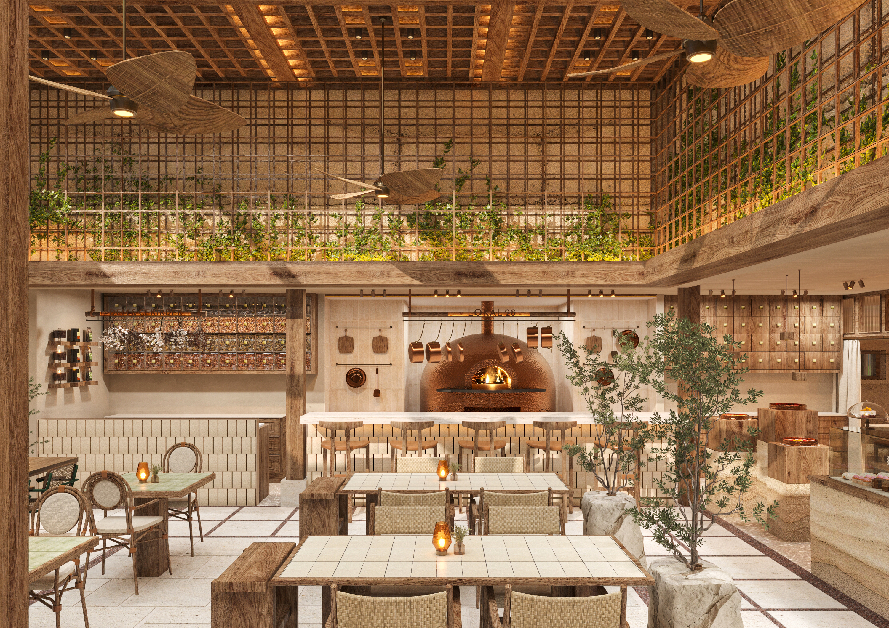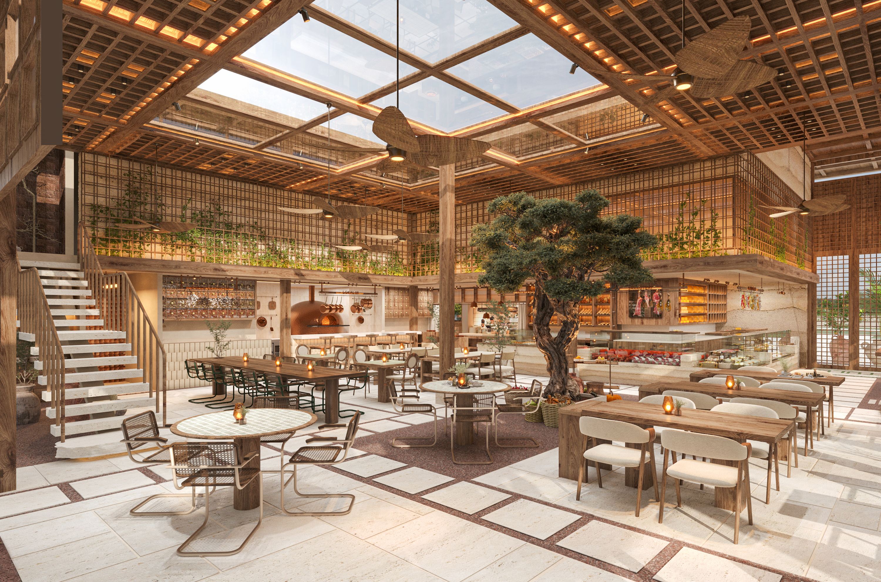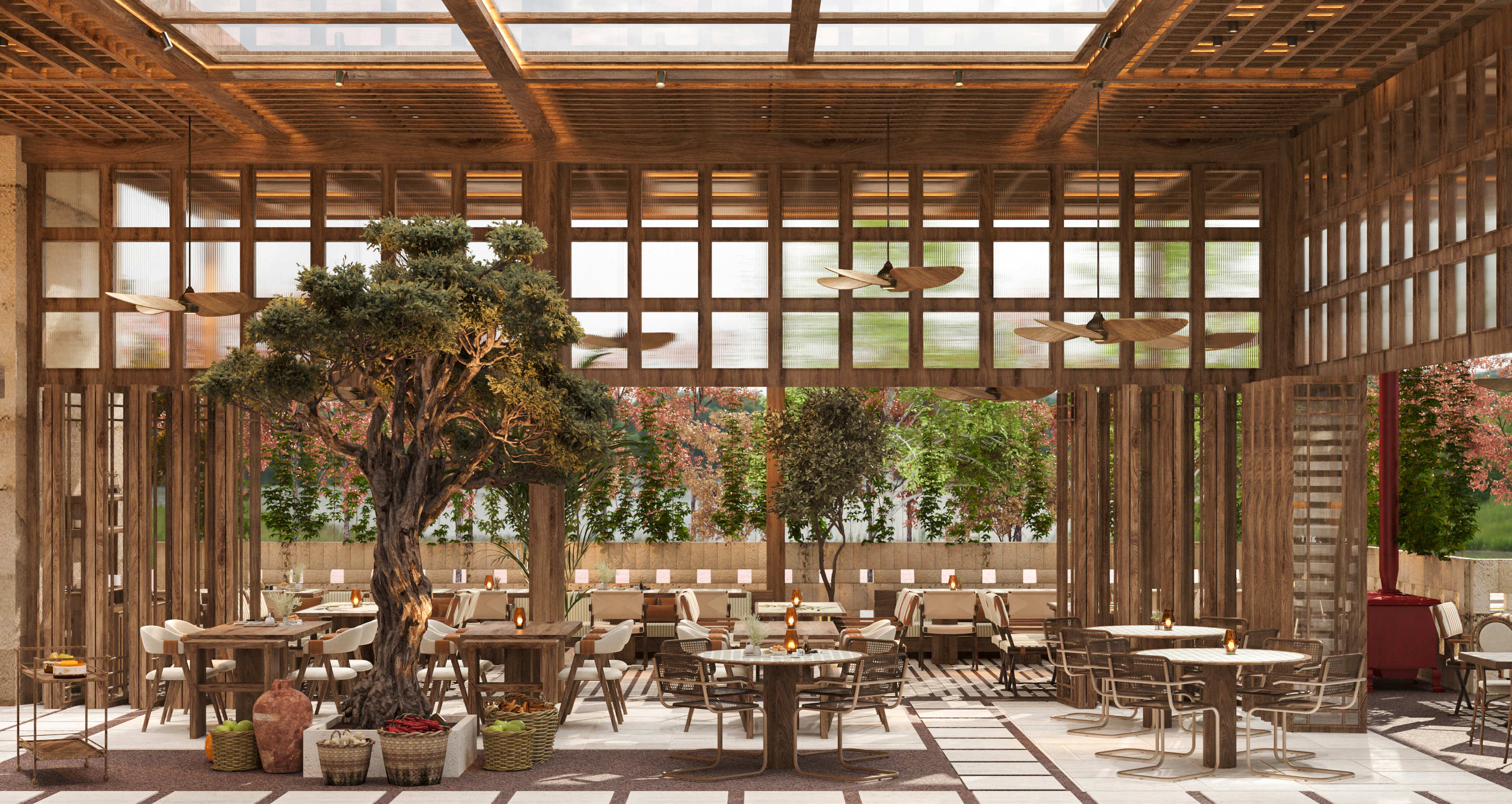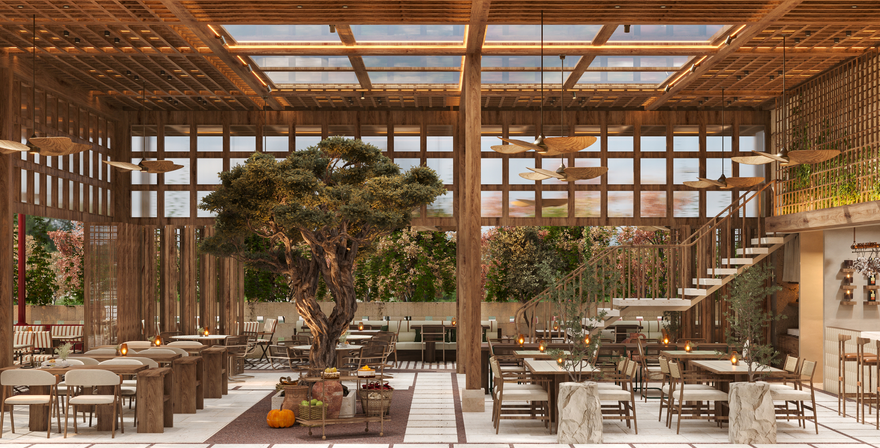 A clear structural expression, defined by a timber grid roof and integrated roof lights, extends seamlessly from interior to exterior, reinforcing spatial continuity and daylight penetration throughout the project. The boundary between inside and outside is further softened through sliding timber-framed glass panels, allowing the sense of being outdoors to extend into the interior. This continuity is reinforced by a sculptural olive tree positioned at the heart of the space, acting as a spatial and atmospheric anchor.
